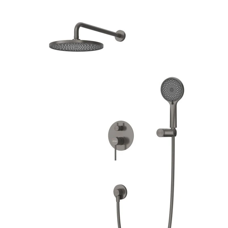 - Оснащение: встраиваемый смеситель с переключателем на два выхода, верхний душ с кронштейном, ручной душ 3-х режимный со шлангом, штуцером и держателем