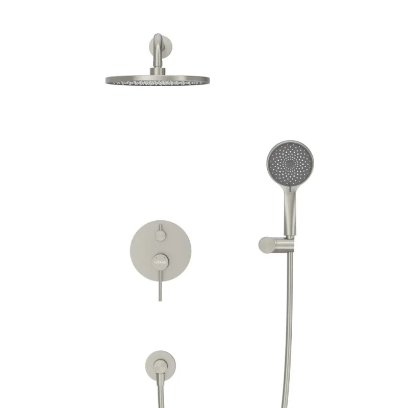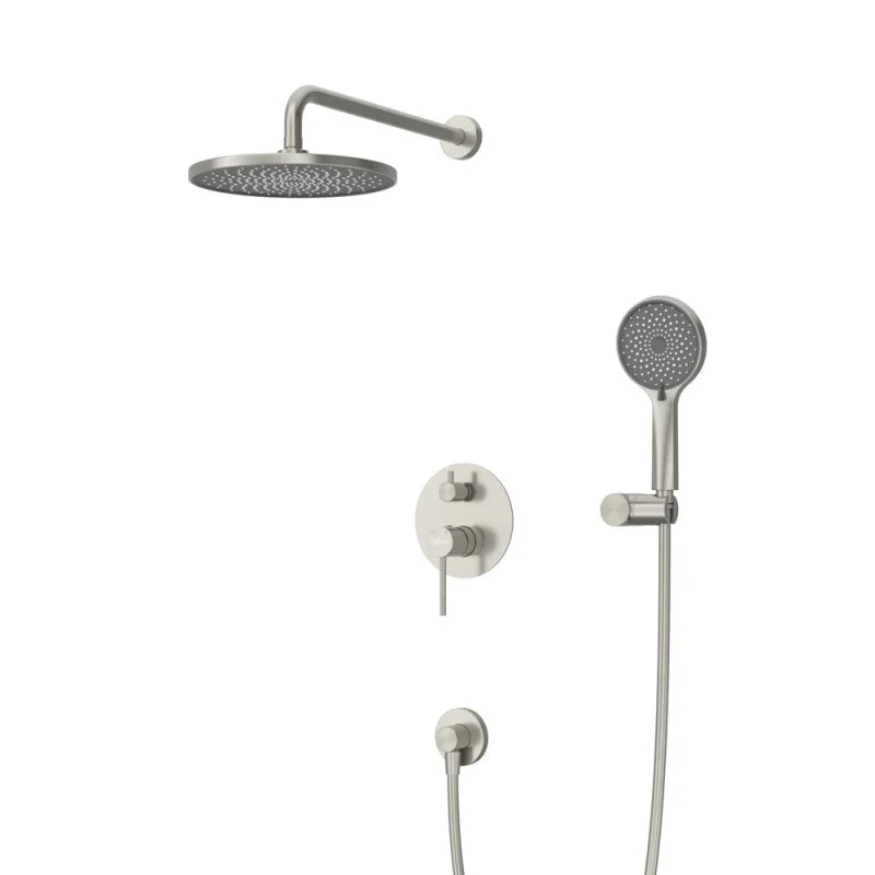 - Оснащение: встраиваемый смеситель с переключателем на два выхода, верхний душ с кронштейном, ручной душ 3-х режимный со шлангом, штуцером и держателем
