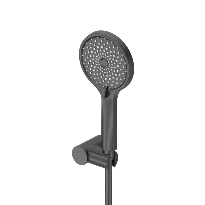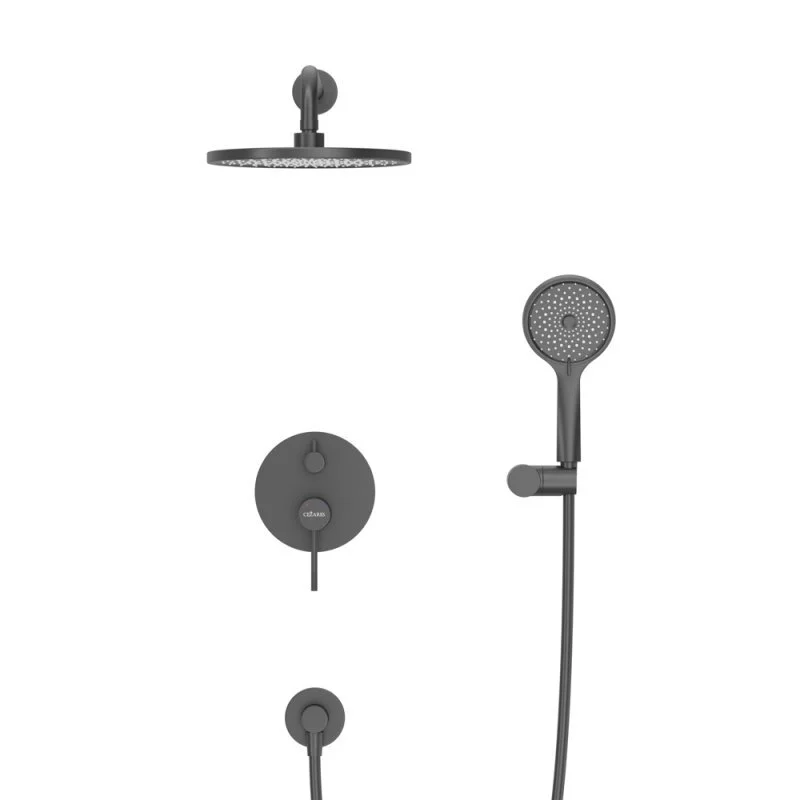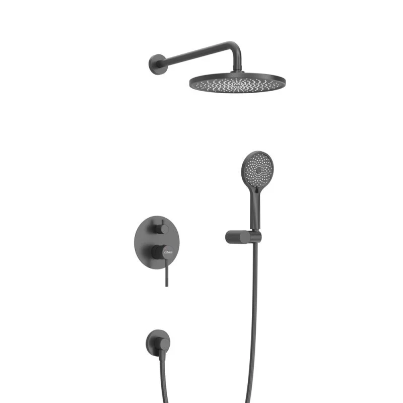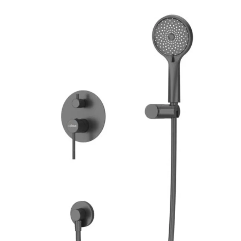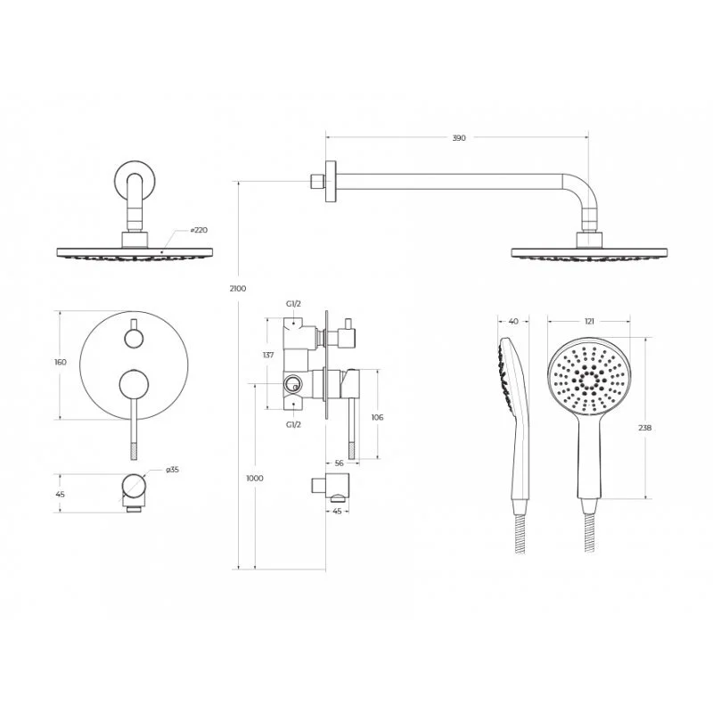 - Оснащение: встраиваемый смеситель с переключателем на два выхода, верхний душ с кронштейном, ручной душ 3-х режимный со шлангом, штуцером и держателем