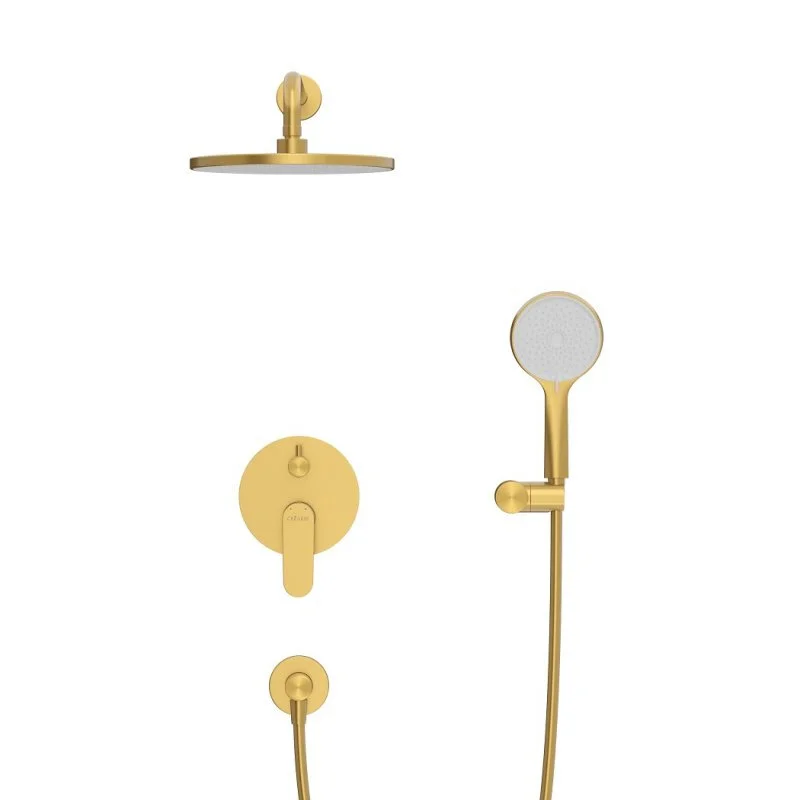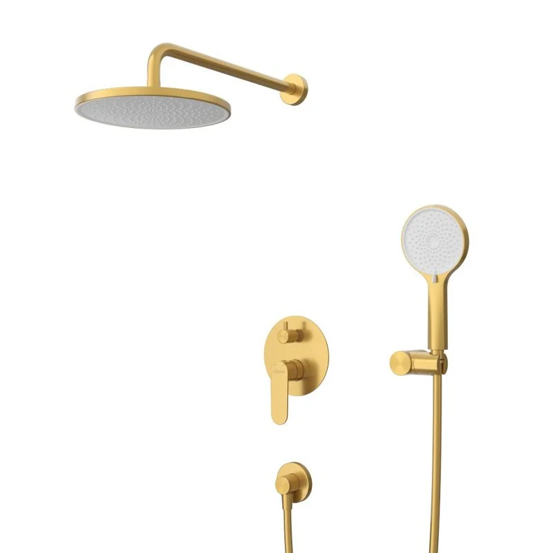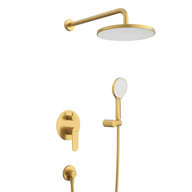 - Оснащение: встраиваемый смеситель с переключателем на два выхода, верхний душ с кронштейном, ручной душ 3-х режимный со шлангом, штуцером и держателем