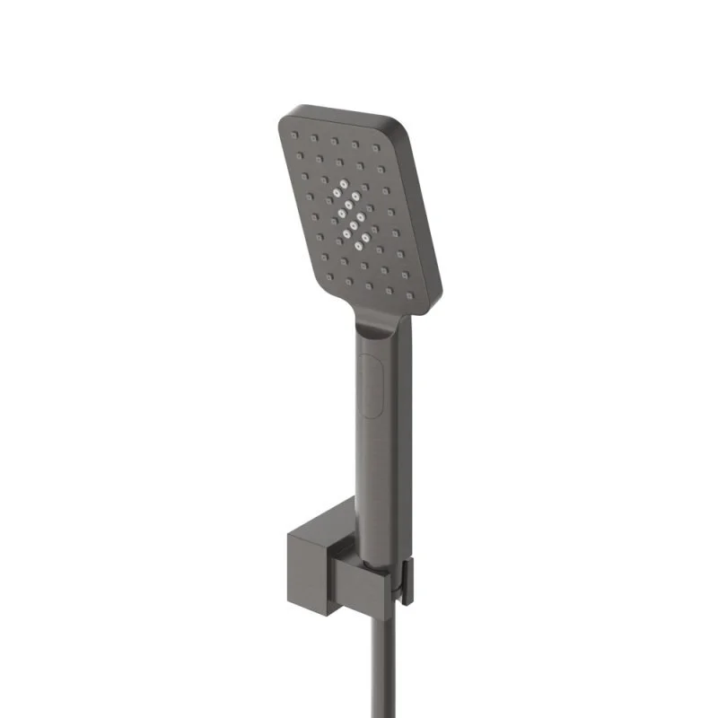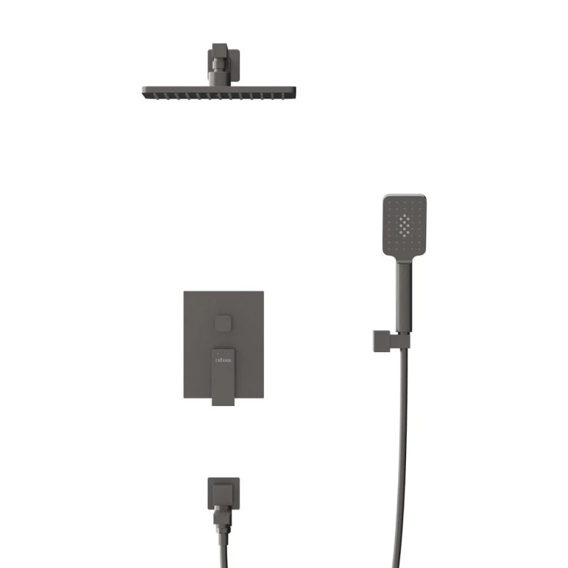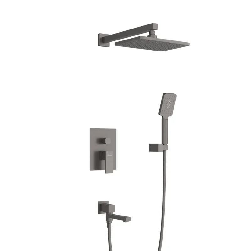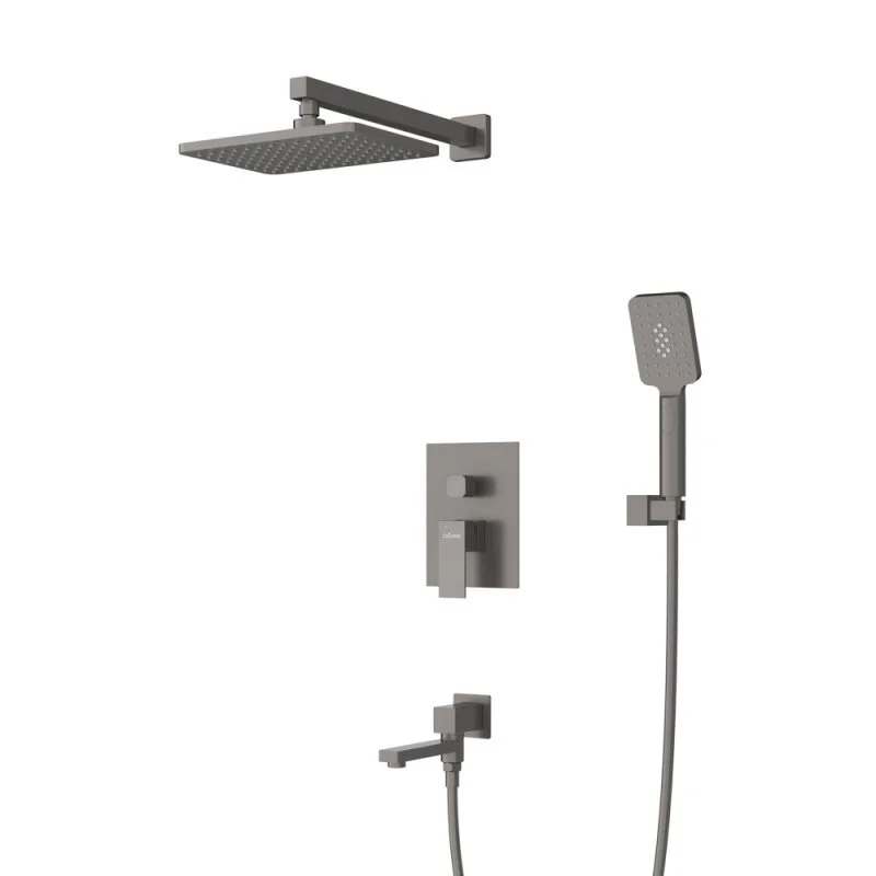 - Оснащение: встраиваемый смеситель с переключателем на три выхода, верхний душ с кронштейном, излив для ванны, ручной душ 3-х режимный со шлангом, штуцером и держателем