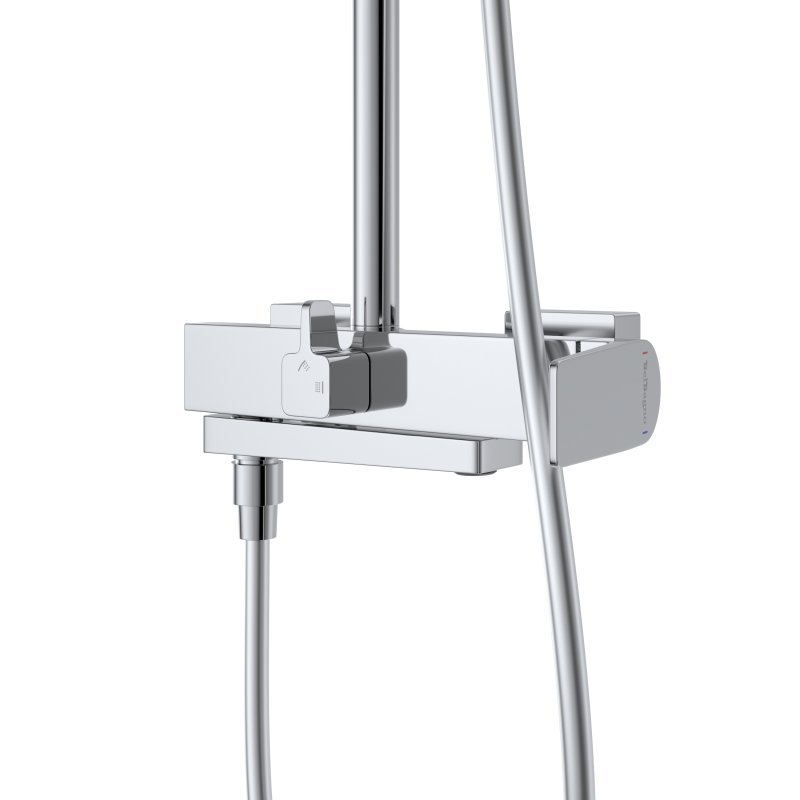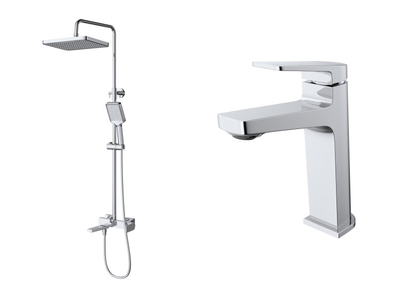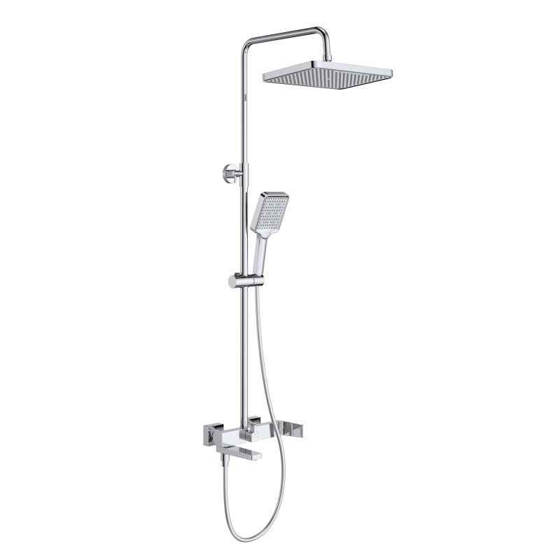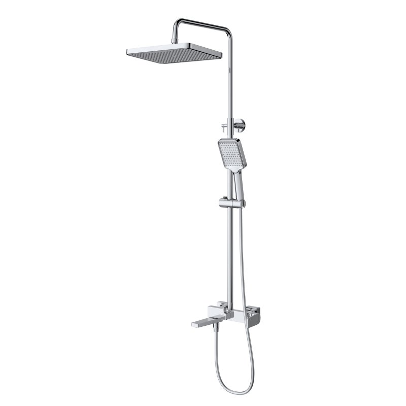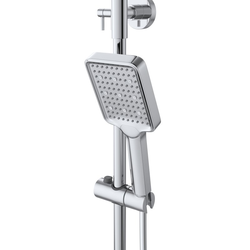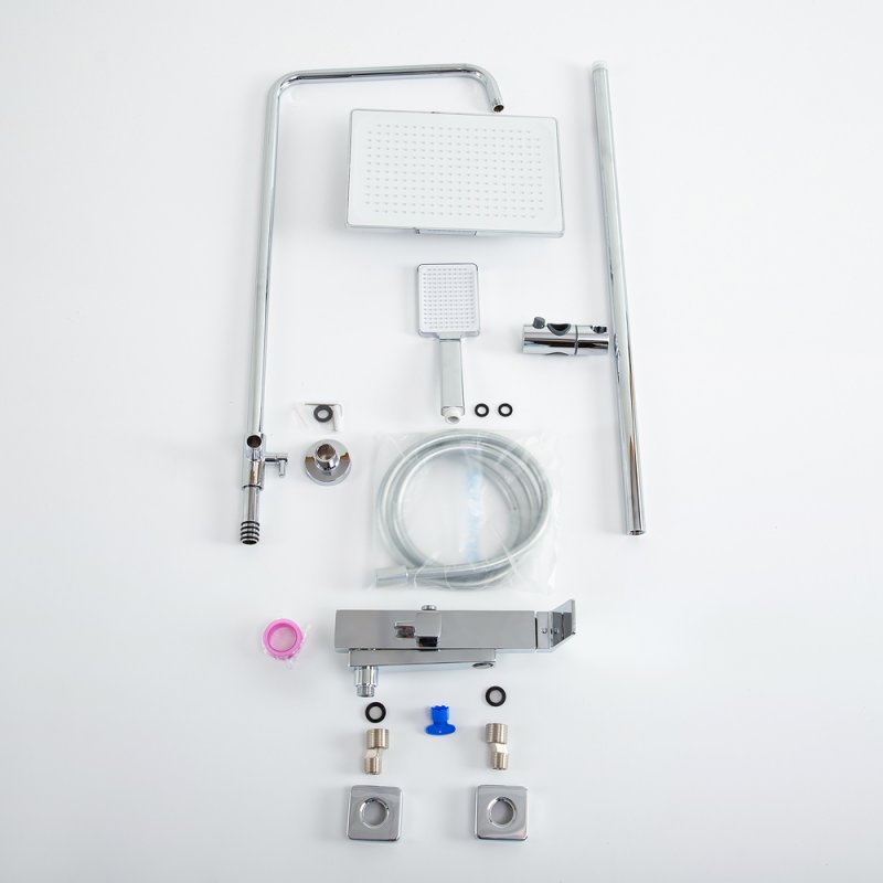 - Смеситель душевой стойки оснащен поворотным изливом с дивертором (переключателем на излив/верхний, ручной душ)