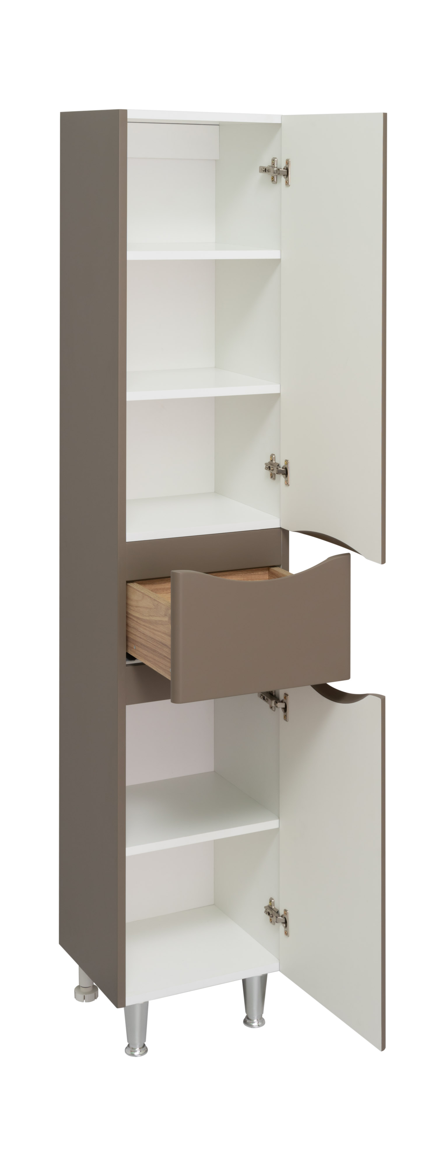 Шкаф пенал для ванной RUNO АФИНА - безупречное сочетание модных тенденций с классическим оформлением ванной комнаты. Шкаф для ванной (напольный) комплектуется ящиком на шариковых направляющих . Шкаф в ванную имеет две распашные дверцы, в нижнем и верхнем отделениях по две встроенные полки. Цвет фасада - бежевый, идеально впишется в любой интерьер ванной комнаты. В комплекте идут петли со встроенным доводчиком, 2 хромированные и 2 пластиковые ножки. Мебель для ванной RUNO - красота и практичность в мелочах!